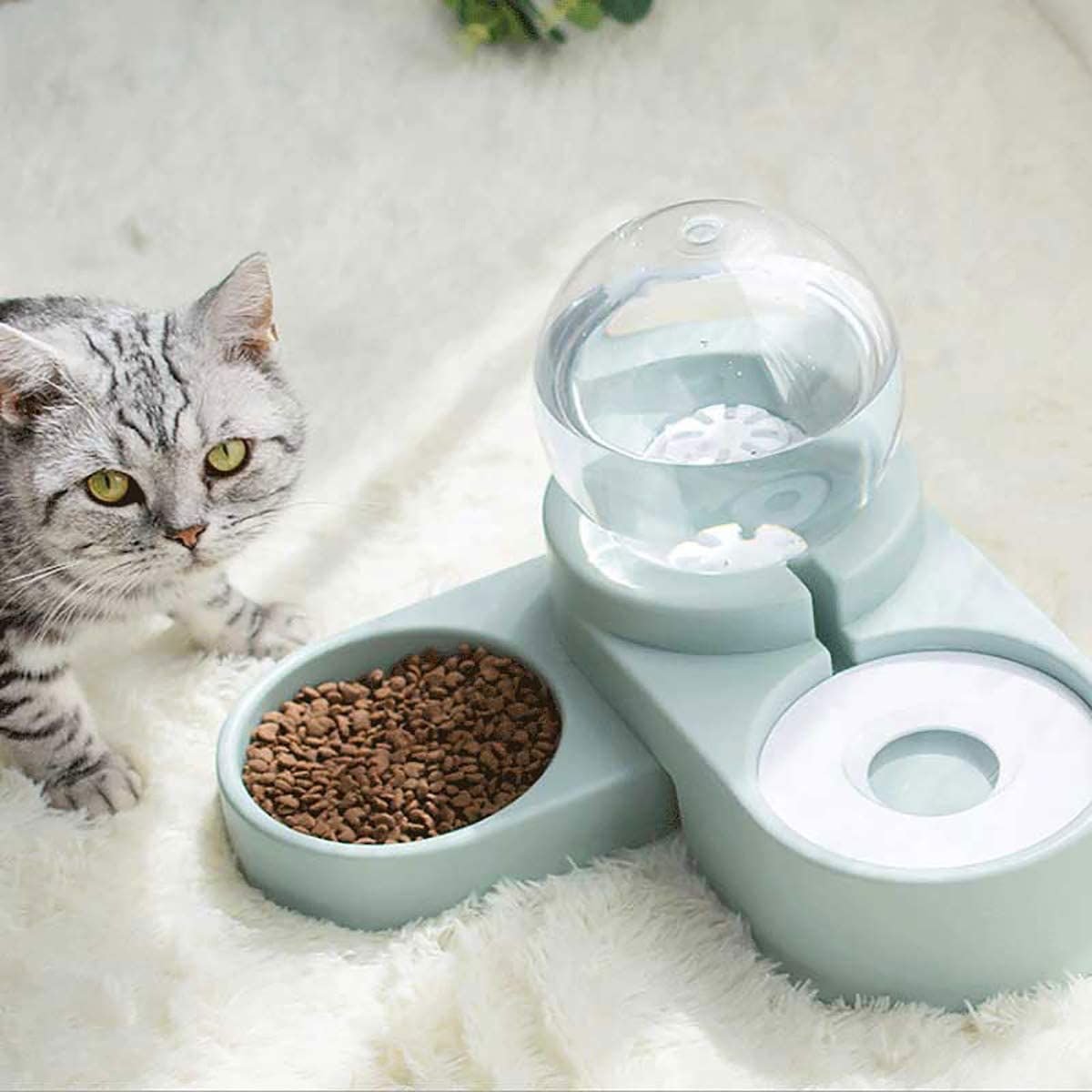 5.2-in-1 automatic water dispenser feeder: 2-in-1 feeder pet bowl design with automatic water bowl, it will automatically re-inject the water into the culture dish, keep the water full and clean whether you are at home or not.